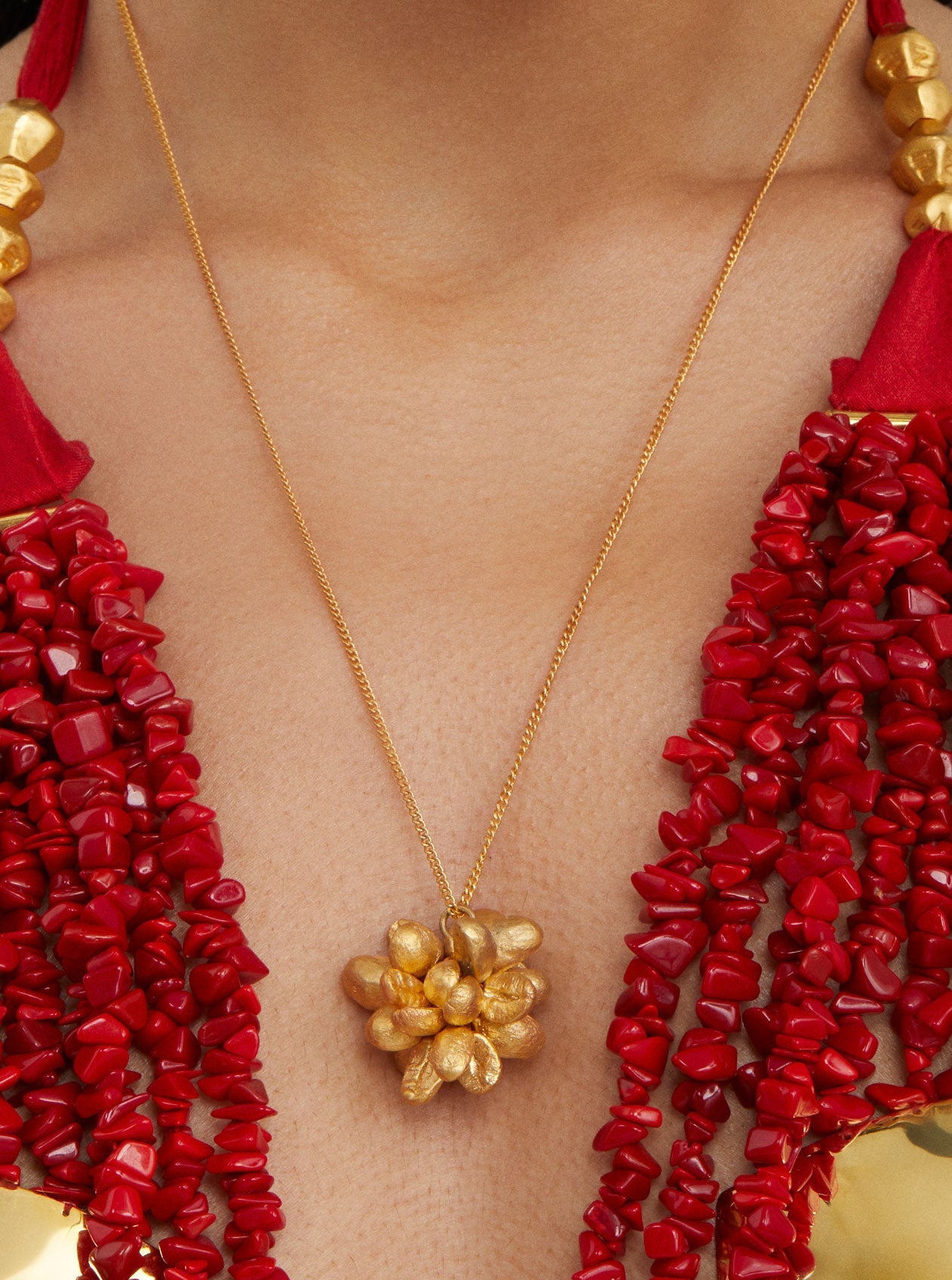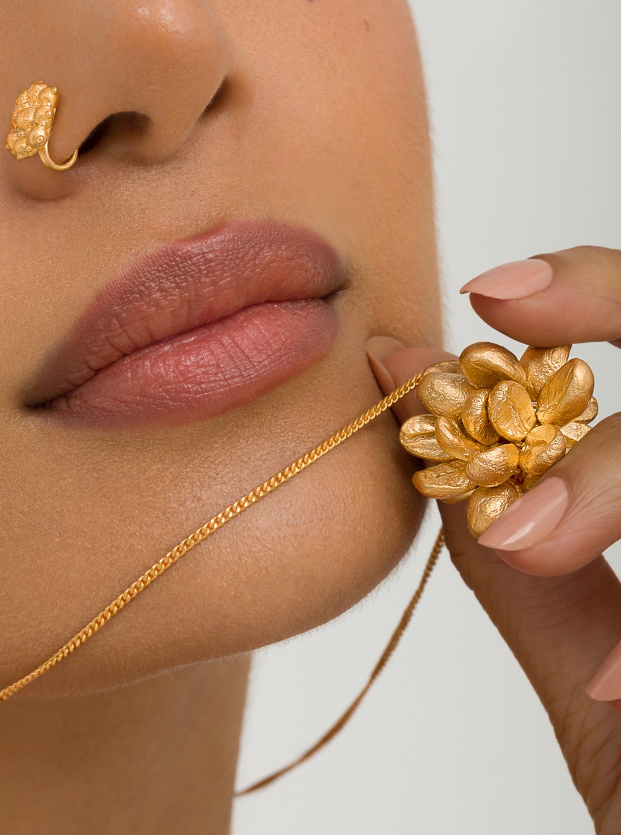 Handcrafted in 22k gold plated bronze, the Kaafi Kolli ring is created using casted coffee beans grown by the tribeswomen of Araku Valley. It mimics the form of the coffee cherries, that form a beautiful red flowerlike bunch as they ripen. Proceeds from the sale of this piece will be donated to the Naandi Foundation, the charitable organisation that has worked alongside the tribal communities and farmers in the region.