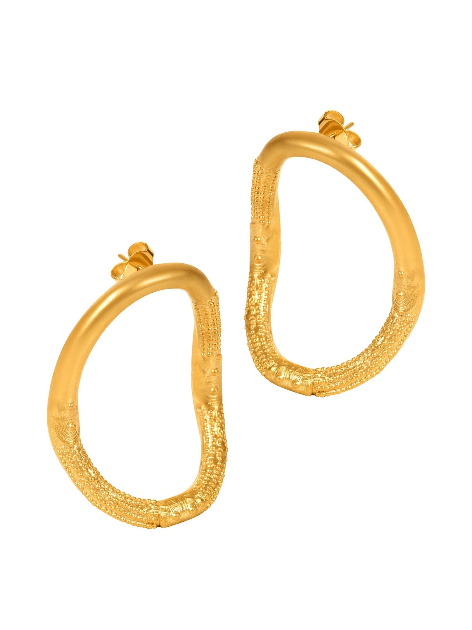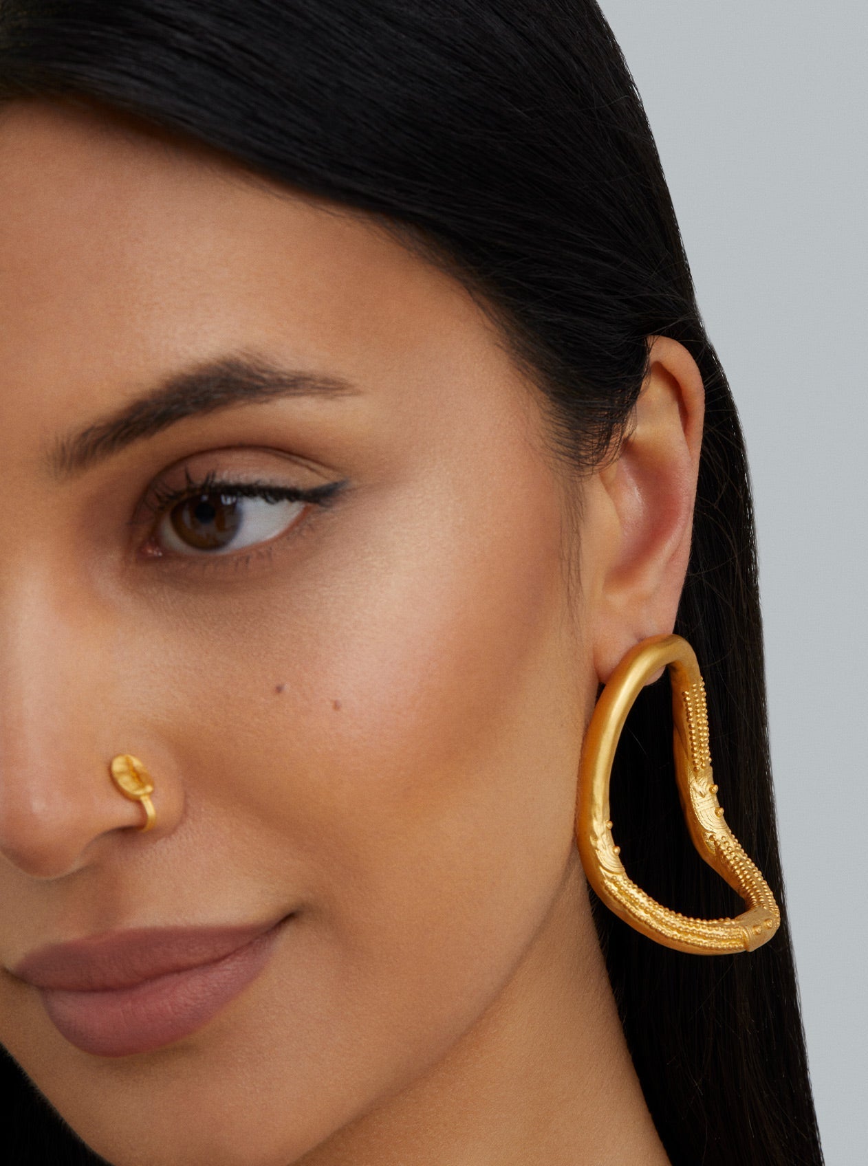 Handcrafted in 22k gold plated bronze the Kod Kaddu hoops are a reinterpretation of the tribal anklet worn by the women of Araku, inspired by its form and the textural details. A tribute to the tribeswomen behind Araku Coffee, the piece is an attempt to bring beautiful heritage jewellery into the contemporary era.