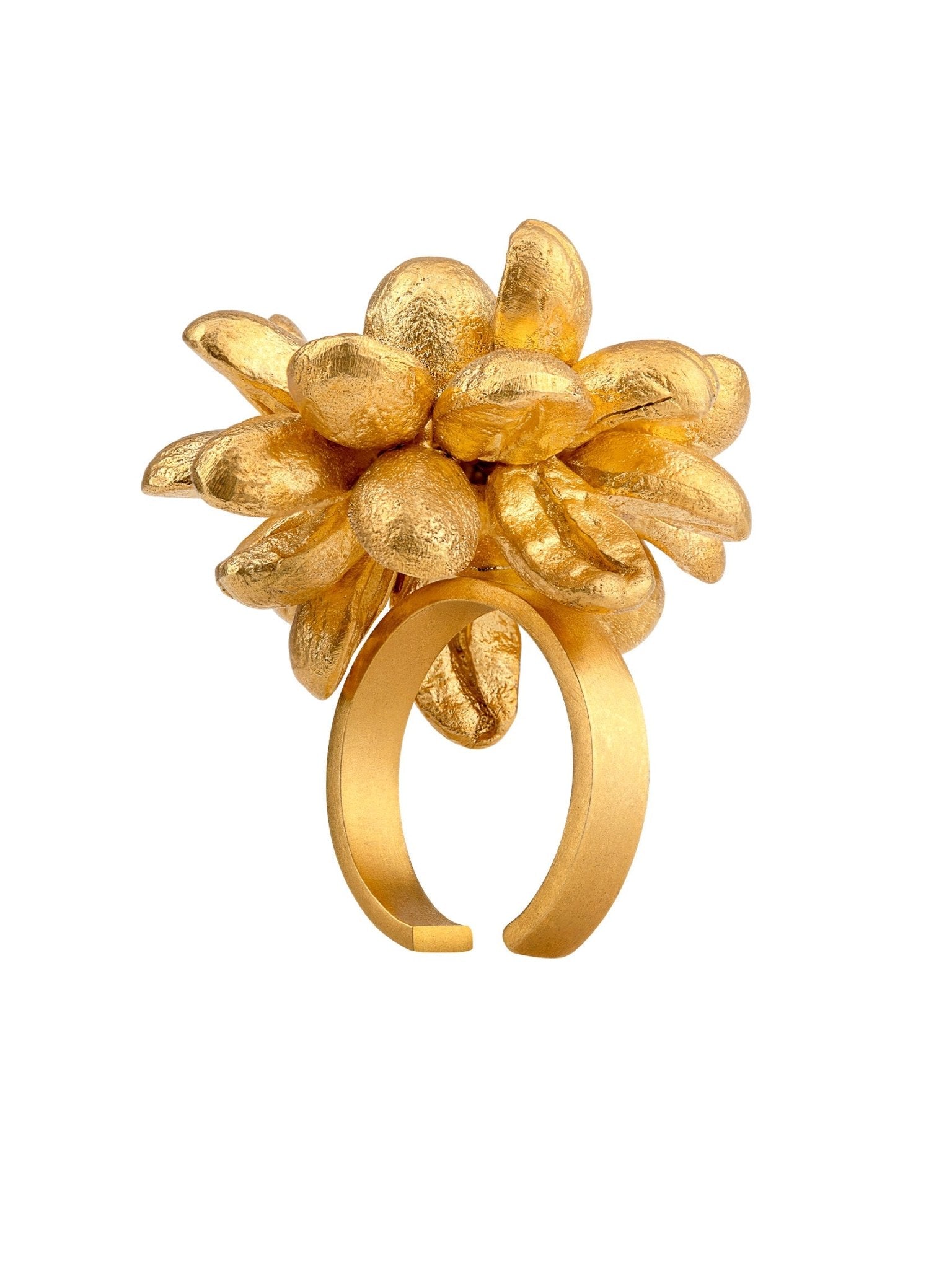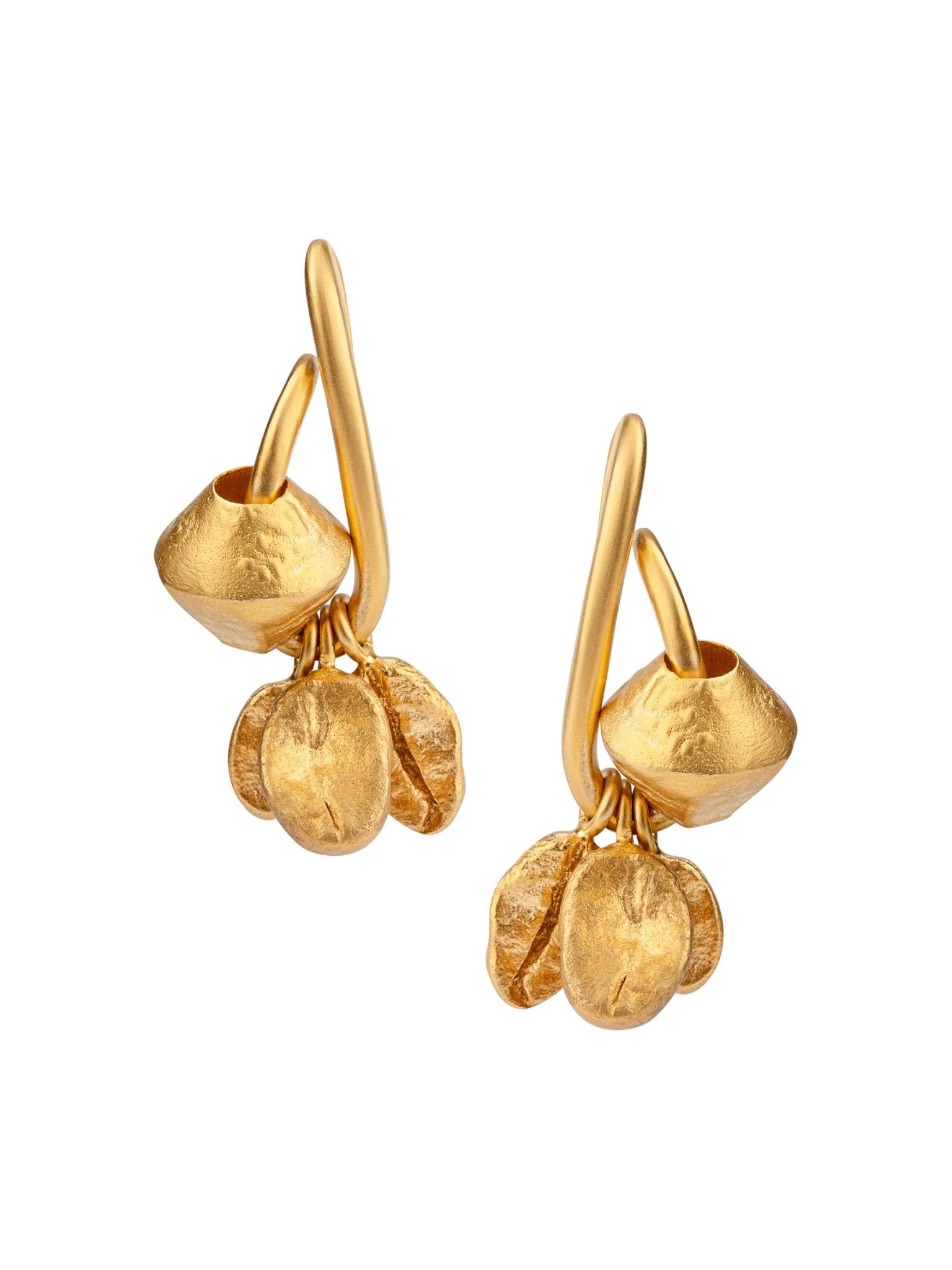 Handcrafted in 22k gold plated bronze, the Kaafi necklace is created using casted coffee beans grown by the tribeswomen of Araku Valley. On either side of the cluster of cast coffee beans are the Pathor studs, reminiscent of pendants worn by the tribeswomen of Araku Valley, the thick green beads call to mind the dark green leaves of the coffee plant and the forests of Araku Valley. Proceeds from the sale of this piece will be donated to the Naandi Foundation, a charitable organisation that has works alongside the tribal communities and farmers in the region.